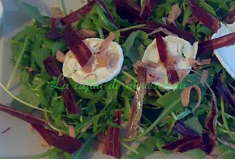 Abrimos una bolsa de rúcula, de las que venden en el súper que vienen ya lavadas y listas para consumir, echamos unas pipas peladas, ponemos 4 ruedas de queso de cabra y repartimos unas finas tiras de cecina (este embutido también es uno de los favoritos en casa) o jamón serrano o ibérico y decoramos con unos rulillos de foié, ¿rulillos? si, yo siempre tengo un trozo de foié en el congelador, envuelto en papel de film que con ayuda de un pelador de patatas o en su defecto un cuchillo (aunque este último no sacará rulillos sino tiras finas) cortaremos despacito, haciendo una pequeña presión de arriba a abajo y veremos como salen solos, esto dá un toque muy "chic" a nuestros platos, también podemos usarlo para tostas de queso, para adornar un solomillo a la parrilla, no sé... echarle imaginación...