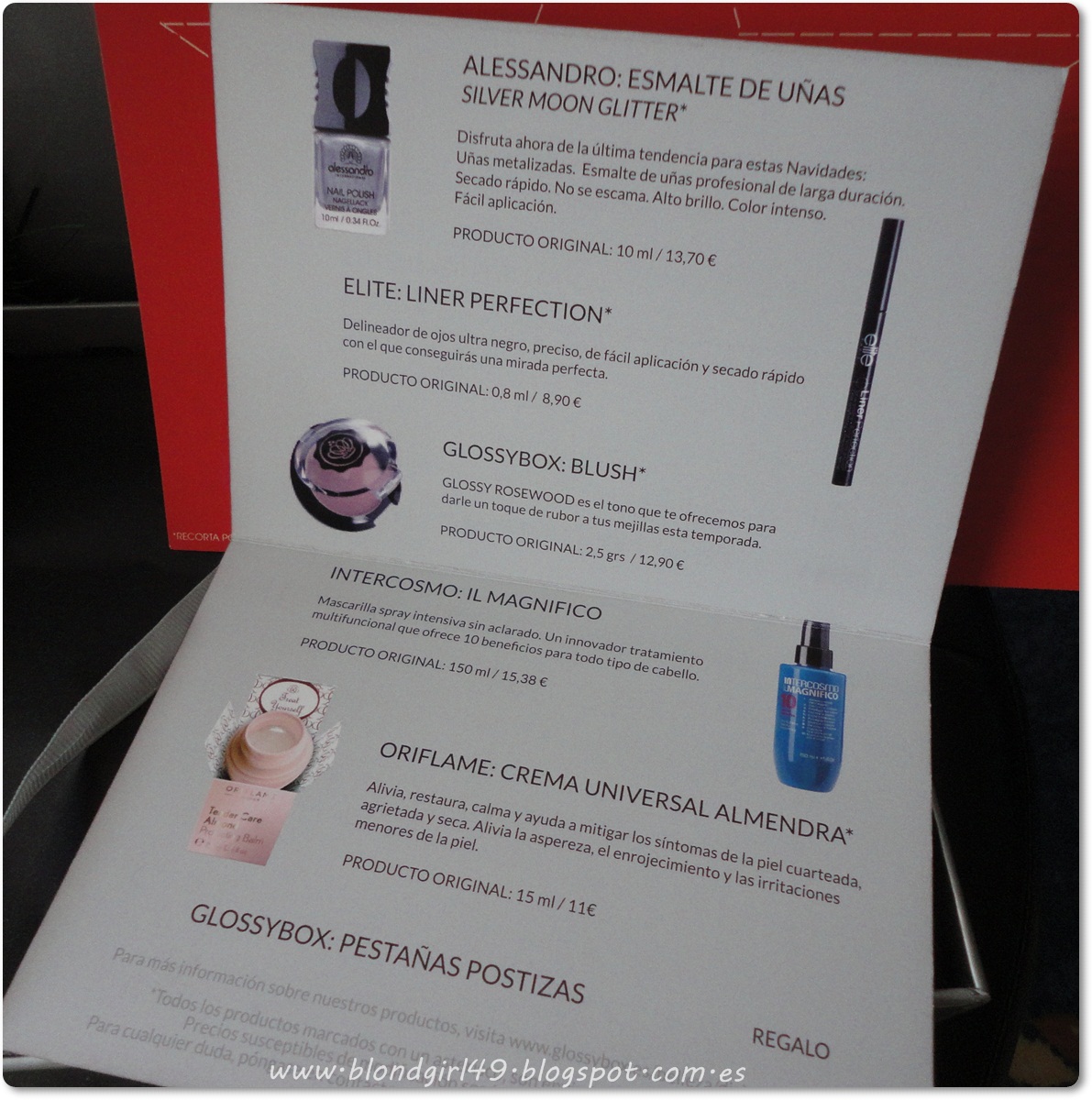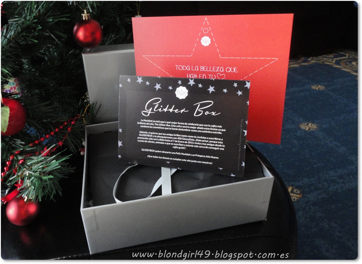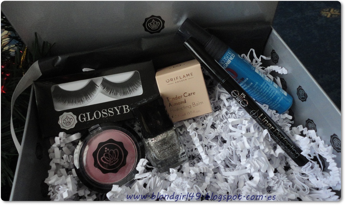 La cajita del mes de navidad es la Glitter Box, supongo que por ser una fecha tan señalada quisieron poner productos que saben que usamos más^^