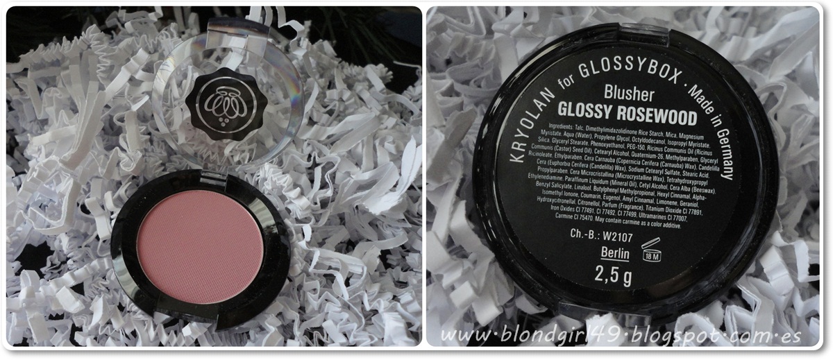 Aquí tenemos un producto de Kryolan que han fabricado exclusivamente para glossybox, se trata de un colorete, el "glossy rosewood" que es un rosita empolvado y con acabado mate muy cuco.Como me encantan los coloretes y sobre todo de esta tonalidad me ha gustado muchísimo! Me parece un poco polvoriento (al menos mas que los que acostumbro a usar) pero no es algo que me moleste y la pigmentación es bastante normalita, una vez aplicado en la piel queda muy sutil por lo que si queremos que se nos vea más hay que insistir. Lo que ya no me gusta es que encuentro que le han puesto un precio bastante elevado pero me supongo que es para subir el valor de la cajita.