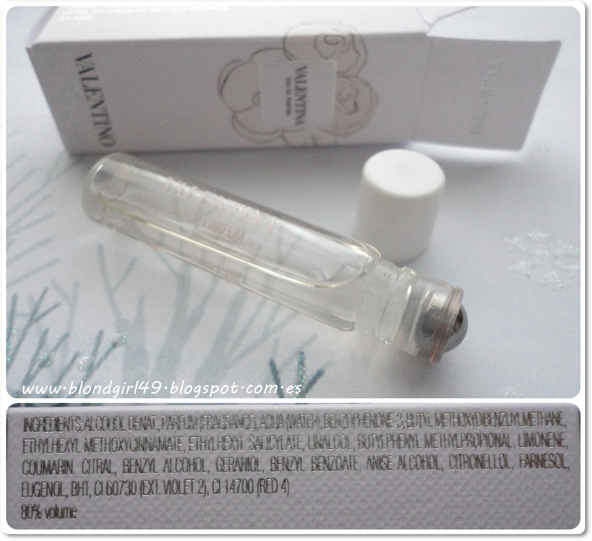 PERFUME VALENTINA de VALENTINO:Pone: fragancia adictiva, cuyos ingredientes definen la feminidad y la singularidad de la mujer Valentino.Nota de salida (frescor): Bergamota y Trufas blancasNota media (floral): Flores blancas, Fresa silvestreNota de fondo (sensual): Cedro, ÁmbarMi opinión: el formato roll-on me parece una monería aunque me da la sensación de que se evapora con más facilidad por lo que no me acaba de convencer. En cuanto al perfume me gusta bastante el aroma que tiene, principalmente noto aroma floral muy suave y con el paso de las horas se va suavizando más. No me importaría tenerla porque seguro que la usaría pero me parece bastante cara.El tamaño original de 80ml cuesta 93,75€, el roll-on es de 2ml