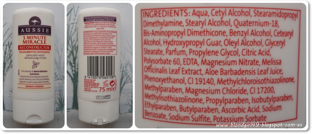 MASCARILLA 3 MINUTE MIRACLE de AUSSIE:Pone que ayuda a reconstruir el pelo dañado, suavizándolo y calmándolo, dejándolo manejable, brillante. La menta balsámica Australiana es una fórmula que te ayuda a reparar las puntas abiertas y a suavizar las cutículas ásperas.Mi opinión: es una marca que me apetecía mucho probar (al igual que la marca apivita) siempre he visto muy buenas reseñas aunque si bien es cierto que me parecen productos algo carillos y por eso prefiero usar otras marcas más asequibles y que me gusta como me dejan el cabello. Esta lleva menta balsámica aunque no he notado que fuera fresca, pero mejor porque ese efecto frío de la menta no me gusta demasiado. El aroma es buenísimo me recuerda a algunos geles de melocotón pero un aroma aún más suave. Me ha encantado como me deja el cabello, incluso me lo deja más lisito cuando me paso el secador :DEl tamaño original es de 250ml y su precio es de 8,49€, en la caja me mandaron una minitalla de 75ml