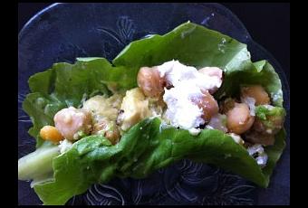Taquitos en hoja de lechuga con garbanzo, pollo y requesón.
