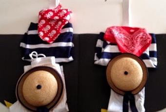 Camisetas o jerseys de rallas marineras. Pantalones blancos, pañuelo al cuello y gorritos. Los nuestros eran de niña porque los teníamos en casa de cuando éramos pequeñas y como me hacía ilusión que los llevaran, se los puse y quedaron muy marineros :)La góndola era otro cantar. He de decir que desde que descubrí la goma eva, soy otra. Qué invento, oye! Unimos 4 trozos negros con forma de góndola delante y detrás y le pegamos trocitos dorados en el perfil. Le cosimos 4 asas, dos por cada niño y fueron tan contentos surcando los mares hasta la fiesta. Tanto les gustó que ahora no quieren tirarla y anda por casa "por si quieren dar un paseo en barco", dicen.