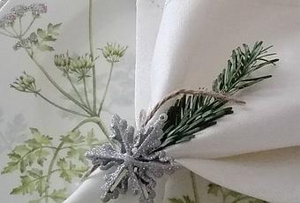 Ya solo queda colocar las servilletas. ¿Os acodáis como doblé las servilletas en forma de abeto para mi mesa de Navidad decorada en blanco y rojo del año pasado? Esta vez ha sido más sencillo, doblé la servilleta por la mitad en forma de pico. Luego la até con un cordel y coloqué una ramita de abeto y una estrella plateada. (Fíjate en la imagen inferior para hacerte una idea)