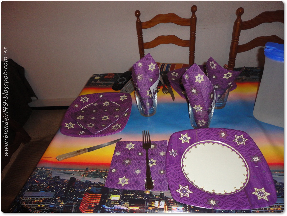 El Xoxo (que es como llamo a la pareja de mi madre) compró platos y servilletas en color morado a juego^^, parecía que ya sabía que mi chico llevaría la camisa también del mismo color jajajaja. Me encantó que tuviera el detalle de comprar cosas específicas para esta noche :D. Allí sólo se ven 3 pero en realidad éramos 5 esa noche :)Os voy a ir enseñando todo lo que preparamos :) vais a flipar de la cantidad de comida xDD... pero es que somos unos tragones de categoría!