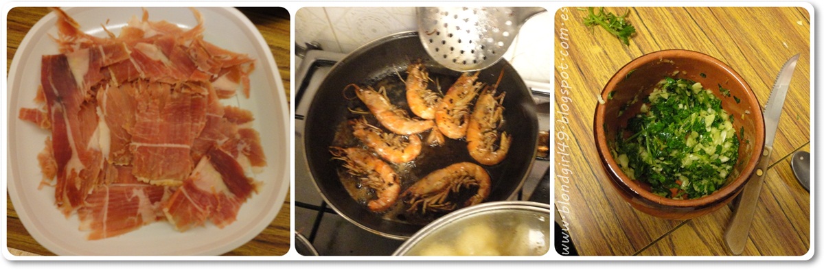 - Jamoncito que corté de la paleta que compraron (los trozos que se ven más gordos fue obra del Xoxo... a mi me gustan tajadas finitas) xDD- Gambas fritas- Haciendo el picadillo de ajo, perejil y aceite para las gambas :)