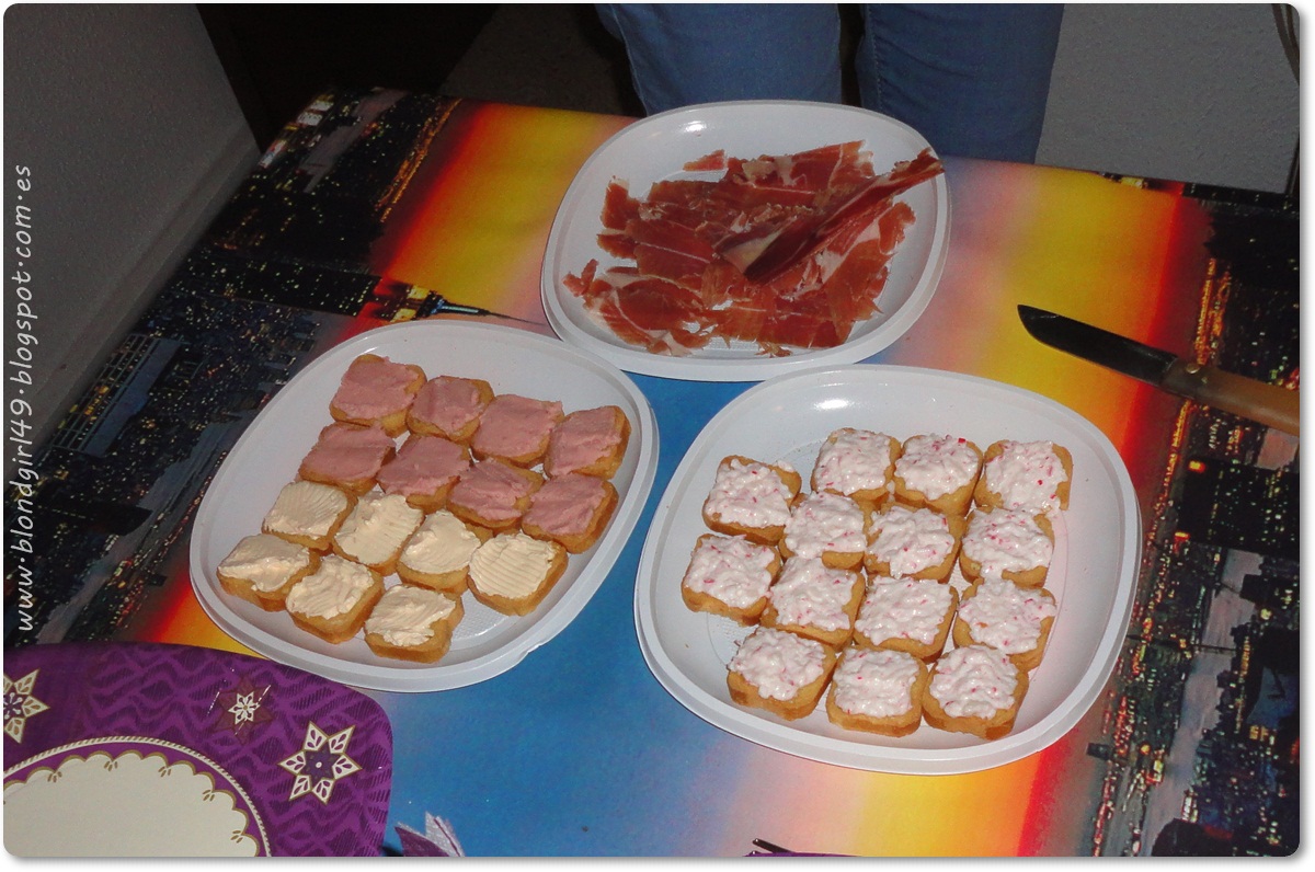 A parte del jamón también preparé los mini biscotes con diferentes patés o rellenos. Había paté de salmón que está bastante bueno, paté de jamón que no está mal y luego el de cangrejo que es gloria bendita (es el que hay un plato entero sólo de ese tipo), yo ya sabía que sería el que comeríamos más así que decidí rellenar un plato sólo de ese relleno :P (¿¿se nota que me encanta el cangrejo??). Si os interesa venden las tarrinas en Mercadona por 1€, está delicioso!!!