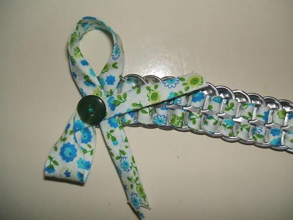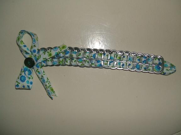 Nada más y nada menos que de las chapas de las latas, una cinta y un botón =) Se la compré a la vecina de una compañera de clase, que las hace de todos los colores. Las lisas a 2€ y las de flores (del color que quieras) a 3€.