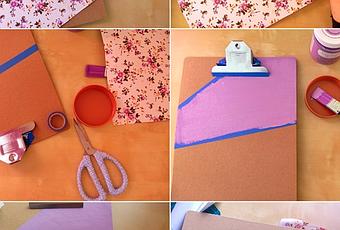 Los materiales principales fueron chalk pint y tela adhesiva. Estas dos, combinando colores.Para ellos marqué la zona a pintar y protegí el clip. Después le di después dos capas de pintura y cuando secó, retiré las tiras de washi que marcaban y protegían.A continuación, despegué una lámina de tela adhesiva y la pegué paralela a la zona pintada. Pegué el sobrante por detrás porque esta tela, al recortarla, se deshilacha.Por último, un toque de washi bonito en la parte superior.Dejé trozos del color natural del cartón, porque ese color me gusta mucho.
