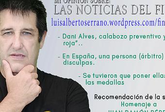 Mi opinión sobre las noticias de la semana FINDENIUS (Año 3, Finde 1). Hablo de: – Dani Alves, en calabozo preventivo y «tarjeta roja» – En España, una persona (árbitro) pide disculpas – Se tuvieron que poner ellas mismas las medallas. … y mi recomendación: – Homenaje a Juan Ramón Pérez (Profetas de Mueble Bar)