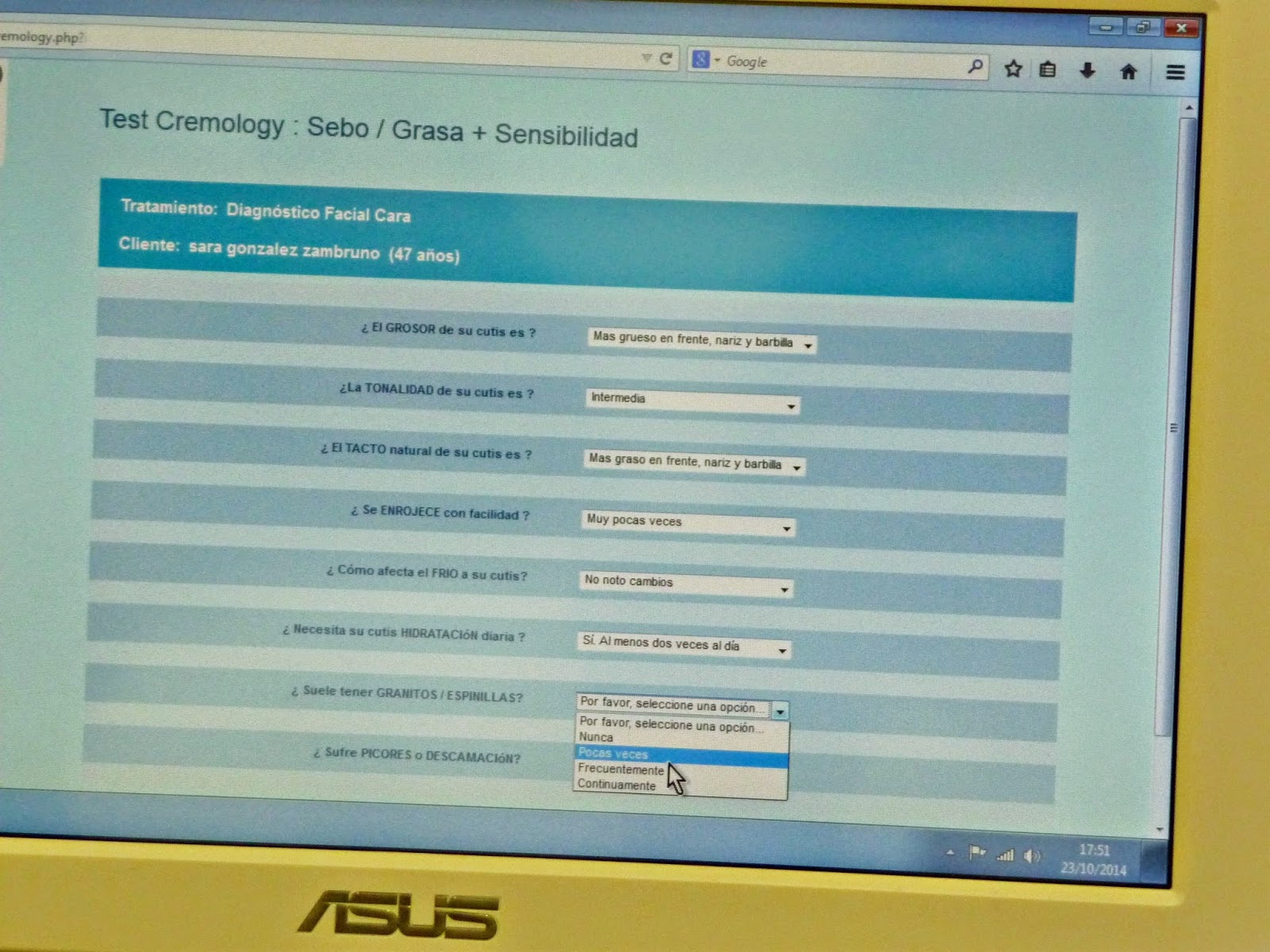 Consiste en un aparato de medición profesional con distintos cabezales para realizar un diagnóstico con el fin de conocer si la piel está hidratada, el nivel de grasa, la elasticidad, la sensibilidad, así como detectar las arrugas, manchas y poros. Te van pasando el aparato por cada zona de la cara y te aseguro que se ve hasta el pelillo del bigote del que pensabas que nadie se percataría.En la foto puedes ver de fondo un recuadro en la pantalla del ordenador. Pues bien, eso son manchas. Me gustaría poder enseñar más fotos pero las hice de manera que respetara la intimidad de la mujer a la que le estaban diagnosticando la piel.