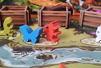 3) Colocamos una de nuestras figuras de animales en el lugar libre frente a cada dado en el tablero central (sólo un jugador podrá ocupar ese espacio) o frente a las cajas de bayas, ramitas o resina (podrá haber más de un jugador). En función de donde nos coloquemos, podremos recoger unos u otros recursos que utilizaremos para comprar una carta del mercado (el hueco libre lo repondremos con otra carta del mazo) y los que nos sobren irán al tablero de hogar para usarlos en siguientes turnos.