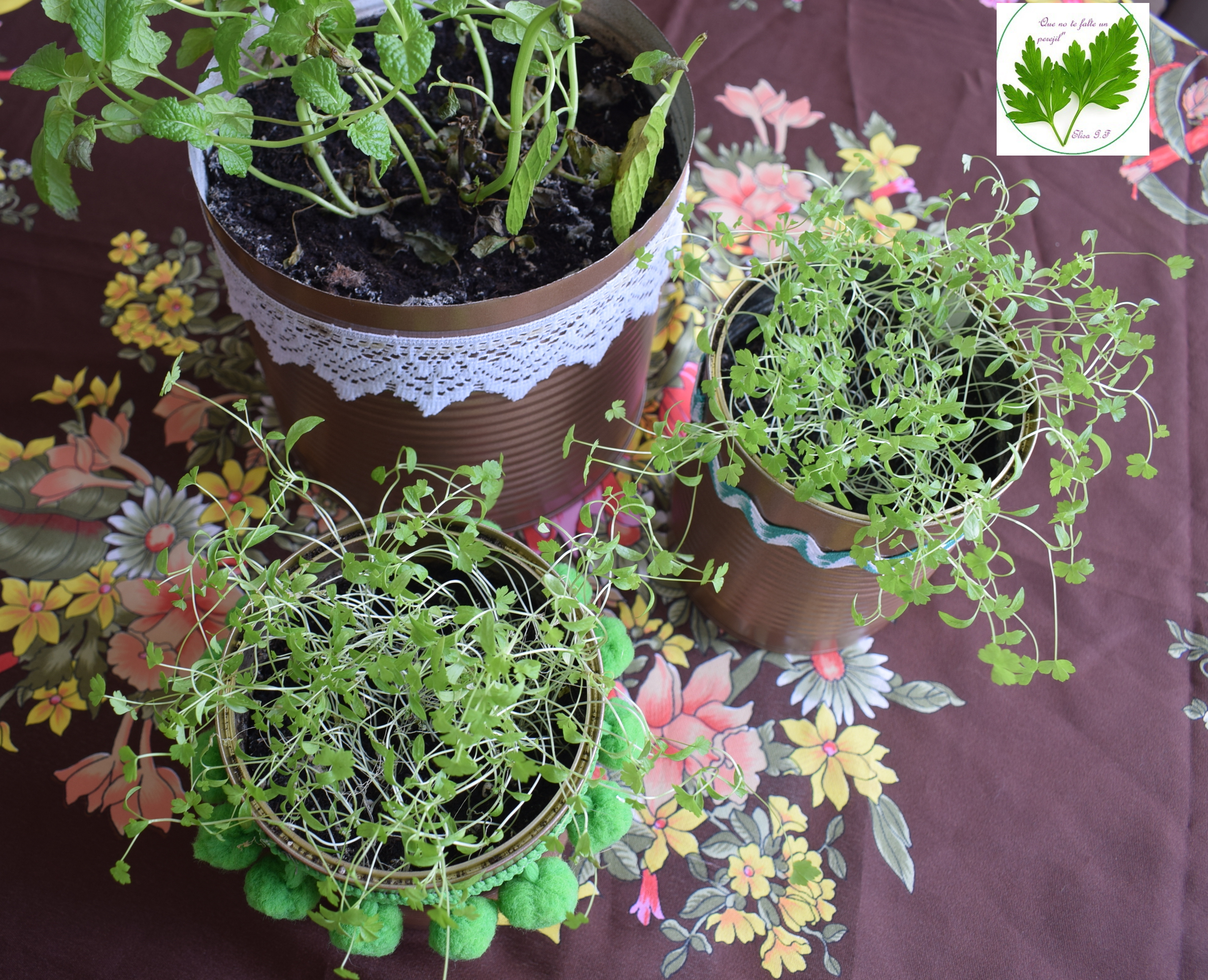 Hace poquito, un buen amigo mío me regaló semillas de perejil para que no me falte nunca, en seguida las planté y están creciendo preciosas. Ya sabéis que en mi casa todo se recicla, así, las puse en unas latas de conserva que previamente pinté con pintura en spray y decoré con restos de borlones y encajes que me van quedando de otras labores. Todo se puede aprovechar en algún momento volviendo a lucir en cualquier rinconcito de mi hogar.
