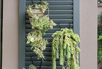 Este fue el primero que reciclé. Lo pinté de verde y le colgué las macetas también intervenidas por mí. Creo es uno de mis reciclados más pineados en Pinterest y quizás también de las fotos más usadas sin mencionar fuente :(