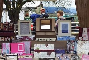 Chic@s !!  Mi primera feria y !! nevando !! yo lo hago todo in extremis.Me propusieron mostrar mis trabajos en la feria anual de mi pueblo  y ! et voilá ! Dicho y hecho, mi marido se puso manos a la obra y levantó " El chiringuito" como el lo bautizó.  Luego un poquito de imaginación , pusimos cuatro telas y sobre todo un buen plástico por si acaso le daba por llover.Y muchas ganas. Pero ni eso nos hizo recular, allí que nos presentamos y como dos chicarrones del norte aguantamos toda la mañana, disfrutamos un montón, hablamos con muchas personas que se acercaron al puesto, para dar a conocer esta técnica que es maravillosa y gustó, pero mucho. Da gusto saber que aun se aprecia el trabajo manual y artesano hecho con corazón.Os dejo unas fotos. ! Feliz fin de semana !
