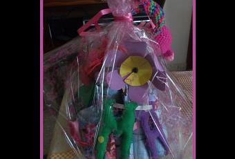 Para la decoración compré papel celofán con dibujitos de ositos, cintas de tela y puse unas flores que tenía de goma eva de un ramo que me hicieron las amigas el día que me hicieron una especie de despedida de soltera antes de la maternidad.