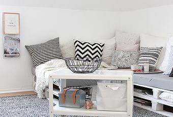Se trata de un rincón con un bajo techo podría ser el típico rincón debajo de la escalera, buhardilla o similar, la combinación en blanco negro me ha encantado pero con un cojín en gris clarito como es este caso se pueden hacer cualquier mezcla de cojines que os podáis imaginar.