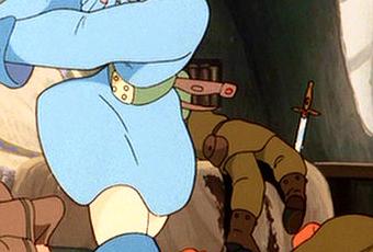 Lo que más me ha impresionado del visionado en cine respecto a las veces que lo he visto tranquilamente en casa, aparte de la mejora de calidad de imagen, es cómo la acción se adueña de la pantalla y se diluye un poco el sentido argumental (en esta impresión seguramente también haya tenido que ver las dificultades para seguir el subtitulado). Los vuelos de los numerosos aparatos voladores de la película típicos de Miyazaki resultan impresionantes, pero si algo me ha impactado son las batallas.