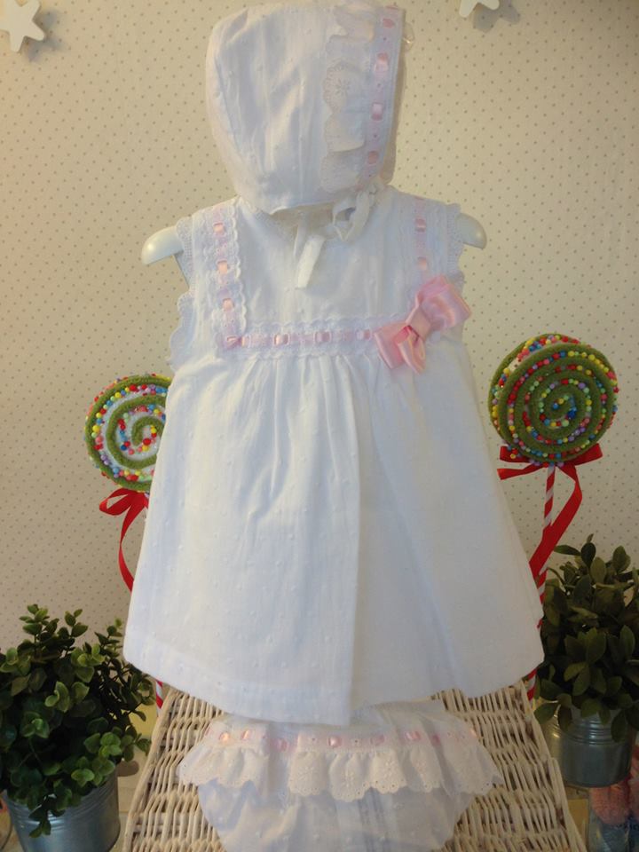 Y aquí faldón sencillo con cuerpo de punto rosa, falda en piqué blanco, y lazo rosita. Una camisa con cuellos y puntos debajo y ale, sencillo y queda precioso y finísimo!