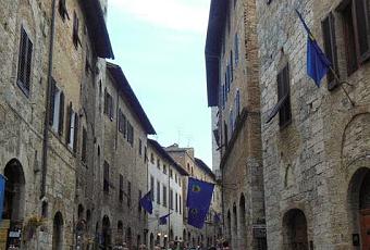 Al llegar con el autobús, el cual te deja en la puerta de entrada a la ciudad, ya ves que San Gimignano es un pueblo de "película medieval" con sus calles estrechas y empedradas, sus paredes antiguas y sobre todo sus múltiples torres. La sensación de estar presente en una ciudad de otra época se percibe rápidamente.