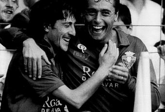 Michael Robinson celebra un gol en Osasuna con Enrique Martín. FOTO: Diariodenavarra