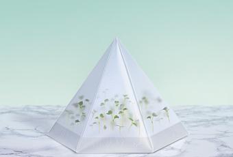 La hoja plegada que nos servirá de invernadero es transparente para que podamos ver cuando germinan los brotes. Su forma de estrella hace que al plegarse se divida el gel y los brotes en seis porciones. De 5 a 14 días es lo que tardan los brotes en estar listos para el consumo.