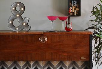 En la parte inferior se encontraban los parlantes cubiertos por panel de tela. Reemplazamos por dos paneles de madera, creando una puerta corrediza y otra fija. Esto nos dejó un segundo compartimiento para vasos. Empapelamos con un diseño bien de los ´60!