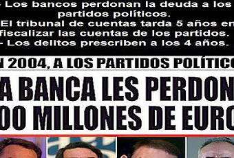 Los partidos políticos son empresas privadas altamente subvencionadas con el dinero público, según sus resultados electorales. Pero como esto no es suficiente para que las citadas empresas sean rentables, sus gerentes tienen que recurrir al dinero de los bancos. La Traka así lo denuncia abiertamente: “Los mismos bancos que extorsionan a las personas, que desahucian a las familias que no pagan por carecer de recursos económicos, no tienen ningún reparo en perdonar deudas millonarias a los partidos incumpliendo, incluso, la obligación de que esos acuerdos de condonación lleguen al Banco de España. Esto lo reconocía el pasado martes el gobernador del Banco de España, Luis María Linde, que compareció a puerta cerrada en el Senado en el marco de la comisión de investigación de la financiación de los partidos que ha impulsado el PP en solitario. El PP citó al responsable de la institución, sin embargo no consiguió lo que buscaba: que le hablara de las condonaciones de deuda al PSOE efectuadas por varias entidades financieras entre los años 2004 y 2006.