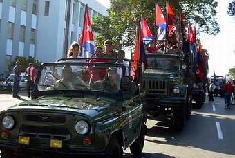 Tres camiones con un jeep a la cabeza avanzan ahora en representación de Santiago de Cuba con 120 pioneros destacados, jóvenes trabajadores, miembros de las organizaciones estudiantiles y los movimientos juveniles, combatientes de las Fuerzas Armadas Revolucionarias y del Ministerio del Interior.