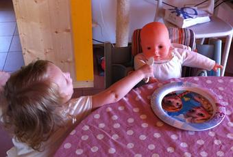 Desde que tiene pocos meses su nonna se empeña en regalarle muñecas… las tenemos de todos los tipos: grandes, pequeñas, duras, blandas, con pelo, sin, incluso tenemos una barbie! ¿No es un poco pronto? Pues si… pero la nonna tiene tantas ganas de que juegue con muñecas que no descarta ninguna posibilidad. Parece, que después de 20 meses, la piccola empieza a hacer caso a sus muñecas!