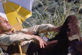 A la playa también puedes ir en plan reina mora con tu colchón y tus cojines para que no te falte de ná como hace Claudette Colbert