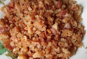 - En una sartén con aceite salteamos los ajos y la panceta. Una vez listos incorporamos las migas y las mantenemos en la sartén hasta que estén hechas, sin parar de remover para que se hagan bien.