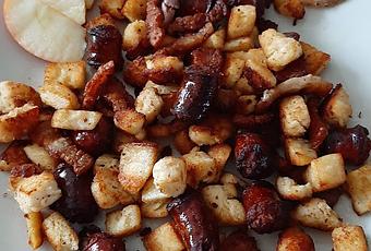 El otro día intenté hacer el pan de @borg_91, pero no lo puse en un molde pequeño y alto y no quedó muy presentable, luego intenté hacerlo de nuevo pero mezclé con las varillas la harina y quedó la masa desinflada, y aunque lo puse en un molde más pequeño la masa no subió, así que como en casa no se tira nada, aprovechando que tenía longaniza roja y panceta en el congelador, he reinterpretado la receta de migas ruleras murcianas.