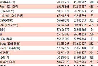 Por otra parte, este suma y sigue de millones generó la lista de los 500 volúmenes subastados, un top en el que se cuelan una legión de artistas orientales y los habituales del circuito, como el incombustible Andy Warhol, o, con un importante crecimiento, Alexander Calder y Marc Chagall. El ranking también resalta el interés de los compradores por la obra de Gerhard Richter y el espectacular ascenso de Wayne Thiebaud, LS Lowry y Stanley Spencer.