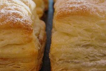 He extendido la lamina de hojaldre y la he cortado en cuadrados iguales de 6x6 cm. obteniendo 24 piezas. He repartido en el centro de la mitad de las piezas una cucharada de crema, es decir en 12 de ellas: en 6 de crema de caramelo y en las otras 6 de crema café. Con un pincel de cocina he pintado los bordes de cada pieza rellena y las he ido cubriendo con una pieza sin rellenar, apretando ligeramente con las yemas de los dedos por alrededor para que se pegaran bien ambas piezas y que al hornear no se abran y se salga todo el relleno. Así hasta terminar con todas las piezas.