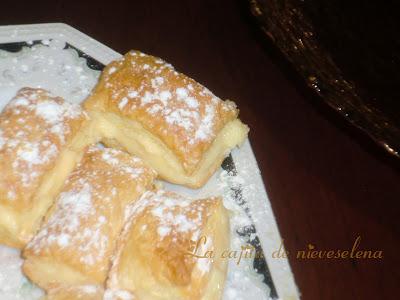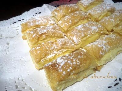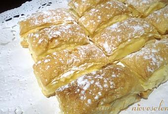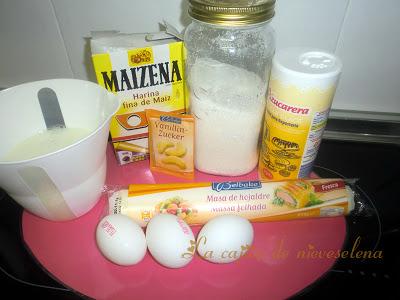 1 lámina de masa de hojaldre Azúcar glas y Crema pastelera: 100 gr. de azúcar 1/2 l de leche 40 gr. de Maizena 3 huevos 1 sobre de azúcar avainillado