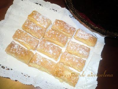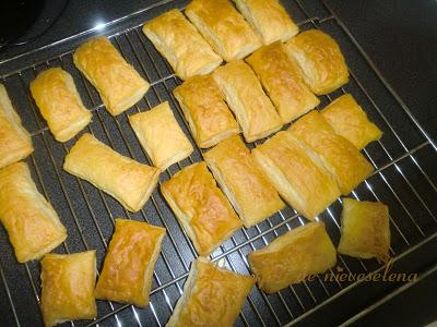 Extendemos la masa de hojaldre y la cortamos en rectángulos. Los colocamos en una bandeja de horno, y horneamos 15' a 200º hasta que estén dorados.