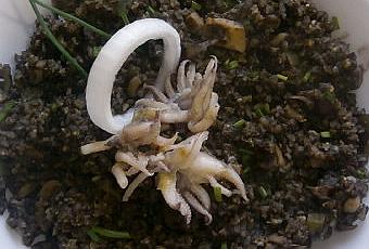 2 c.s de aove.1 taza de mijo (250 grs)2- 2 ½ tazas de agua4 c.s de vino blanco.1 cebolleta picadita.½ tomate muy maduro.½ pimiento verde italiano muy picado1 ajo.1 ramita de perejil.2 hebras de azafrán.6 choquitos (sepias pequeñitas) o 1 calamar o 1 sepia (unos 250 grs)Las tintas de los choquitos o una bolsa de tinta de calamar (de venta en los congelados).Sal.Elaboración:Lavamos bien el mijo, lo escurrimos y lo dejamos secar en un paño de cocina mientras preparamos “el fondo”.Ponemos al fuego una cazuela con el aove y cuando esté caliente le añadimos la cebolla muy, muy picada (casi rallada) dejamos unos 5 minutos que se haga y le añadimos el pimiento también muy picado, otros 5 minutos de cocción. Mientras, machacamos en el mortero el ajo, el perejil y el azafrán, a esto le añadimos la tinta de los choquitos (o la bolsa de tinta congelada) y el vino blanco. Reservamos. Al sofrito de la sartén le ponemos el medio tomate, sin piel, muy picado y dejamos 5 minutos más.Ahora es el momento de añadir los choquitos (o la sepia) muy picados y rehogar un par de minutos, pasados los cuales añadimos el mijo. A todo esto le volcamos el contenido del mortero (ajo, perejil, azafrán, tinta y vino)rehogamos tres minutos, le echamos el agua y la sal y como si de una paella se tratara dejamos cocer 20 minutos al mínimo de calor, hasta que se absorbe el agua y nuestra preparación queda negra como una noche sin luna.Nota: El azafrán desprenderá más su aroma si lo “tostamos” un poquito. ¿Cómo? Pues con papel de aluminio, doblamos varias veces un trocito de papel de aluminio y hacemos una especie de cuchara o contenedor, sobre el que colocamos las hebras de azafrán y con ayuda de un mechero le damos un poquito de calor por abajo (muy poco) o directamente ponemos el papel de aluminio unos segundos sobre el fuego muy bajo, hasta que el azafrán tome un color rojo fuerte (no marrón)ENSALADA DE ESPARRAGOS Y…MAS
