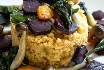 ELABORACIONEmpezamos haciendo un caldo con las verduras troceadas. Las hervimos a fuego lento durante una hora. Colamos. Con las verduras del caldo podemos hacer un puré. En una olla ponemos un poquito de aceite de oliva virgen extra y sofreímos el ajo troceadito y la cebolleta en brunoise. Añadimos 1l de caldo y cuando rompa a hervir echamos el mijo. Estará listo en unos 30 minutos. Mientras, salteamos las verduras. Cortamos las zanahorias en rodajitas, las hojas de col en trozos medianos y picamos pequeño el diente de ajo. Salteamos a fuego vivo, junto con las setas, con un poquito de aceite de oliva virgen extra.