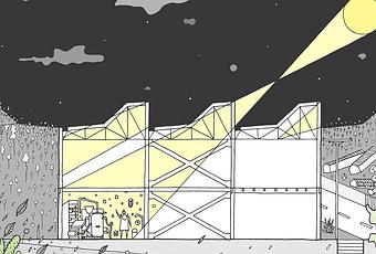 Se trata de una estructura libre y espaciosa, una carcasa compuesta por un basamento de bloque negro de cemento y una cubierta metálica que en conjunto consigue, con la mínima materia posible, la máxima cantidad de metros cúbicos habitables además de calentar, proteger del viento, ventilar, proporcionar sombra y aislar. Una respuesta ante la tipología de fábrica industrial de cubierta con cumbrero muy común en la región.