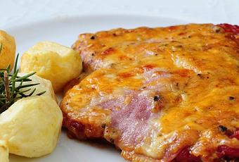 5 filetes de falda de ternera finos 2 huevos batidos pan rallado de ajo y perejil salsa de tomate frito casera 5 lonchas de jamón york grueso 200 gr. de queso rallado para gratinar (yo he utilizado un queso tex-mex que lleva especias y picante) orégano patatas pequeñas para guarnición