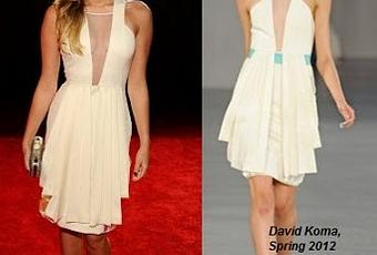 Miley Cyrus, con un vestido blanco a la rodilla, de escote en uve con transparencias, de David Koma, Primavera 2011, que combinó con zapatos de Jimmy Choo, modelo Tippi, efecto serpiente. Un look juvenil que consigue un aprobado. Discreta