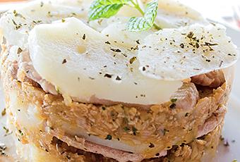 Ahora procederemos a montar el plato con ayuda de un aro de emplatar, que los podréis encontrar en cualquier tienda de todo a 100 o los actuales "chinos" muy bien de precio. La base será de patata, la sujetaremos con una capa de salsa, y sellaremos un las lonchas de solomillo. Esto lo repetiremos otra vez: Patata - salsa - solomillo, o cuantas veces os entre en vuestro aro de emplatar. La capa de encima será patata.