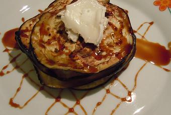 - Para montar el plato sólo tenemos que decorar con miel de caña, poner una capa de berenjena y otra de queso, tantas veces queramos, siendo el último trozo de queso.