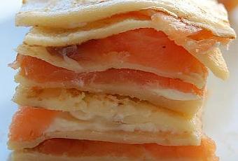 Pondremos una base de creppes, untamos con queso, una lámina de salmón ahumado, una lámina de creppes, queso de untar, lámina de salmón ahumado, así tantas veces como queramos de alto, acabando con una lámina de creppes.