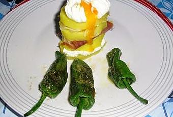Ingredientes:4 patatas12 pimientos celtas1 cebolla4 huevos80 gr de queso de untar (podéis utilizar el de sabores)4 lonchas finas de jamón curado1 pizca de pimentónaceite de olivapimientasal
