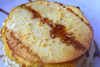 Se cortan las manzanas en rodajas gruesas y se ponen en una sartén con un poco de mantequilla y una cucharadita chica de azúcar, se deja hacer por los dos lados hasta que esté blandita y un poco caramelizada,y se retiran del fuego.