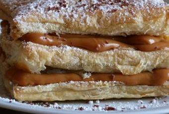 - Luego cubrimos con dulce de leche en forma generosa y colocamos la siguiente tapa de hojaldre, para nuevamente agregar otra capa de dulce de leche y por último otra tapa de hojaldre.