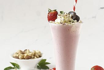 Ingredientes:- 150 g de fresas sin pedúnculo.- 4 bolas de helado de nata.- 120 g de leche fría.Para decorar:- 120 g de nata de montar.- 2 cucharaditas de azúcar glass.- Unos pocos frutos secos picados.- 2 Bon Roll partidos por la mitad.
