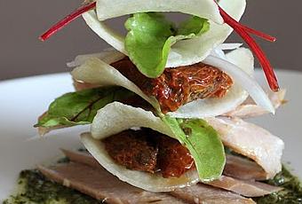 Sal y pimienta negra en grano molido.Procedimientos: Para el aceite de albahaca: Escaldamos la albahaca ligeramente sin que llegue a hervir el agua. La enfriamos con agua y hielo para que no se siga cociendo. Cogemos la albahaca bien escurrida y la pasamos a un picador. La trituramos y le vamos incorporando el aceite poco a poco.
